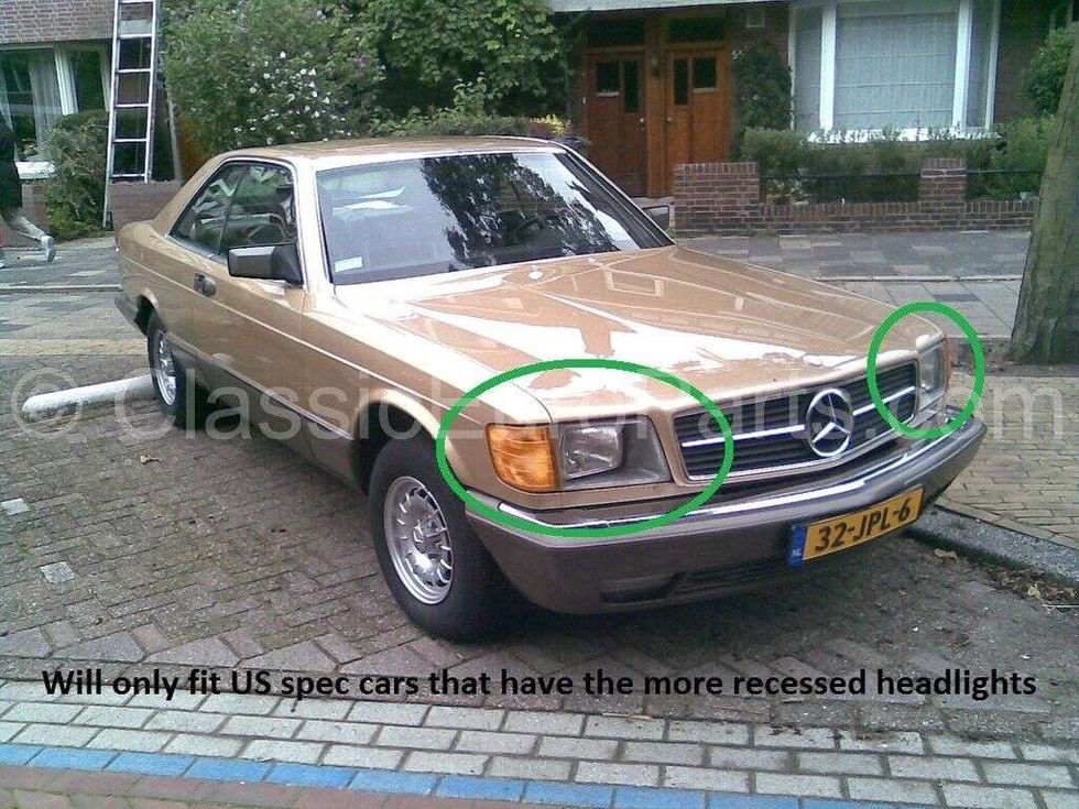 Sealed beam to Euro H4 headlight insert conversion kit for US spec W126 sedan and coupe Early models (1979-1986). Will NOT fit Euro headlights and Late model US spec headlights (1986-1991)- see the two last pictures for reference. This is the straight forward bolt on kit without the Euro small city lights- does not need any wiring modifications. This kit is for LHD cars. The kit includes left and right side headlight inserts (E approved); H4 bulbs (Hella); 2 rubber sealing caps. These lights will provide approx two times better lighting performance and whiter color light compared to the DOT sealed beam headlights and allow for you to change the bulb if needed. These have the Euro spec light pattern with sharp cutoff. These are brand new good quality aftermarket parts. All of the bulbs are genuine quality Hella items. Mounting: These are secured to the standard US headlight bucket using the securing frame and 4 small screws as originally- very easy to replace. The US spec sealed beam plug does not need to be changed as it fits these lights- plug and play. Fits: W126 Early model sedan & coupe (1979 – 1986) US spec cars only. Will NOT fit Euro cars and US cars made after 1986. Delivery: These lights are delivered with FedEx / TNT Express WITHOUT any extra cost so that means that you will be able to get them faster compared to regular post.