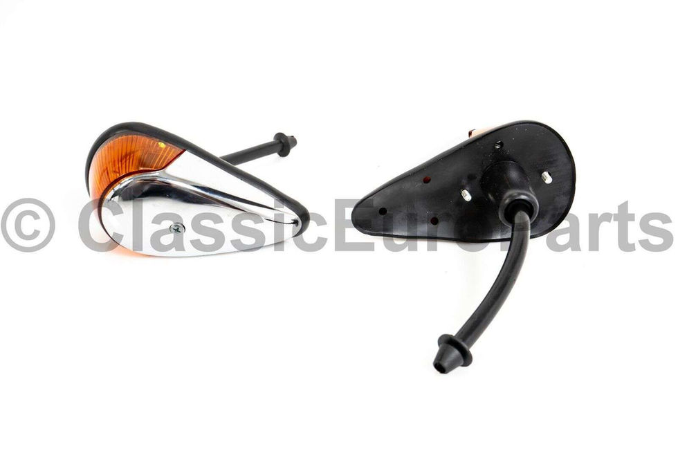 Amber front turn indicator set with chrome housings for VW Type 1 Beetle (August 1963-July 1974) and VW Beach buggy and Type181 (1969-1979). Set includes both left and right turn indicators. These are brand new aftermarket parts. Mounting: These need to be bolted to the front fenders. Fits: Type 1 Beetle (August 1963-July 1974) VW Beach buggy Type181 (1969-1979) If you need any other part for your car – please ask or visit http://www.classicjpparts.com as we do have a huge selection of parts for vintage VW and Porsche cars available.