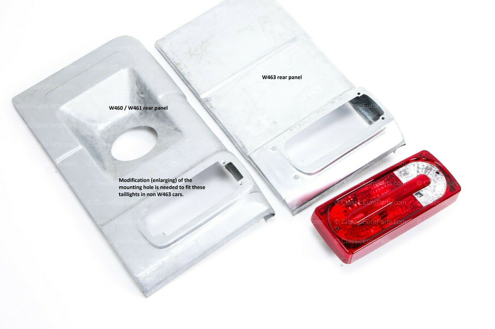 With some modifications these can also be used on the super early W460 / W461 cars- see the last picture with taillight mounting panel comparison- some material can be removed and a few holes drilled from the early cars body to allow fitting of these lights. But some sealant may need to be applied on top of the rubber seal in the corners to ensure 100% waterproof sealing against the body.