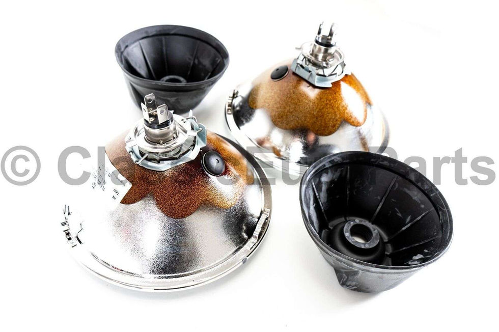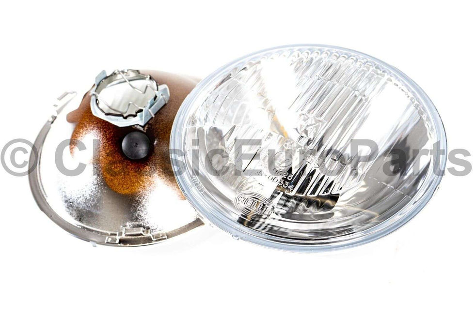 RHD specific Sealed beam to Euro H4 headlight insert conversion kit for USA spec W198 cars. This is the straight forward bolt on kit without the Euro small city lights- does not need any wiring modifications. This kit is for RHD cars. Great to have if importing a car form the USA to the UK or any other RHD country. The kit includes left and right side Hella headlight inserts (E approved); H4 bulbs (Hella); 2 rubber sealing caps. These lights will provide approx two times better lighting performance and whiter color light compared to the DOT sealed beam headlights and allow for you to change the bulb if needed. These have the Euro spec light pattern with sharp cutoff. These are brand new good quality OEM Hella parts. Mounting: These are secured to the standard US headlight bucket using the securing frame and 4 small screws as originally- very easy to replace. The US spec sealed beam plug does not need to be changed as it fits these lights- plug and play. Fits: W198 (1954 – 1963) US spec cars with round headlights only. Delivery: These lights are delivered with FedEx / TNT Express WITHOUT any extra cost so that means that you will be able to get them faster compared to regular post. If you need any other part for you W198- please ask.