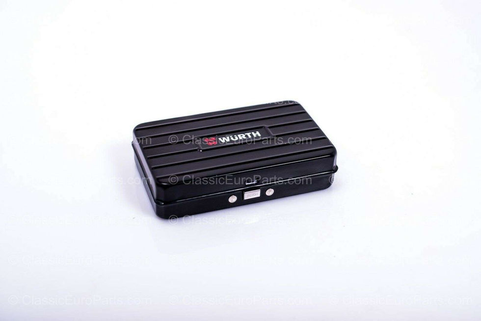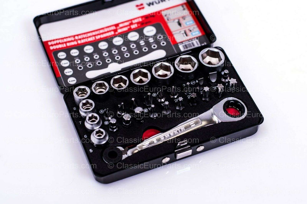 Mini metric emergency tool kit for owners of European cars like BMW ; Audi ; VW ; Porsche ; Mercedes and others. These tools are handy for work in tight and hard to reach places (engine bay) and interior trim as the thickness of the ratchet wrench with an installed socket is only 18mm compared to the 37mm of the standard small 1/4” ratchet wrench. Also the thickness of the ratchet with installed bit is only 18,5mm compared to the standard 57mm. The black metallic tool box is only 13x8x3 cm (approx 5,11 x 3,15 x 1,18 inches) big which makes it perfectly small for storing in the glove box or in the trunk of your car. The inside of the box has soft foam organizer to prevent the tools from rattling. The set includes 31 pieces: 115mm long double ring ratchet spanner with switchable directions Sockets: 5; 6; 7; 8; 9; 10; 11; 12; 13; 14 mm (these are compatible with the standard 1/4” square drive ratchets and handles) 1/4” hex mounted Bits: Torx: T10; T15; T20; T25; T27; T30; T40 Hex: 3; 4; 5; 6 mm Phillips: PH0; PH1; PH2 (2 pieces of PH2) Pozidriv: PZ0; PZ1; PZ2 Flat: 0,5×4,0mm; 1,0×6,0mm The tools are Brand New high quality items made by Wurth Germany. Using: Great for working on Euro cars. Superb for use in hard to reach areas. The schematic pictures are the property of the respectful owner. CEP is not affiliated with Wurth company.