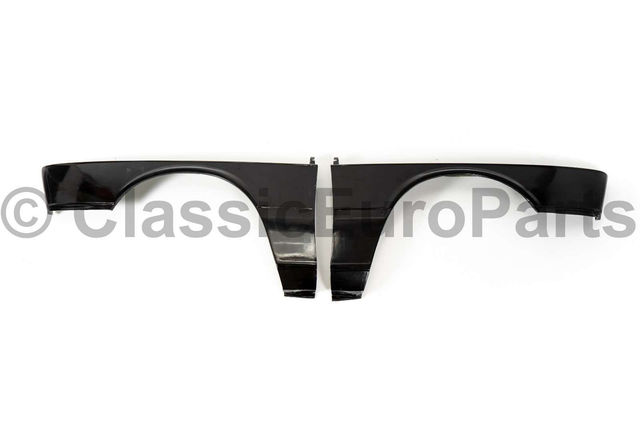 Euro front fender set for E12. Replace your old rusty front fenders with these that will never rust again. Set includes both left and right side fenders. Fits both standard E12 and M535 models. Replaces NLA OEM part numbers: 41351820467 and 41351820468 Please see the last picture for illustrational purposes. These are brand new aftermarket parts made from Pflex- a mix of multiple composite materials including carbon and kevlar. As these are aftermarket replacement parts some paint preparation is always needed (sanding, filler, primer and paint) Mounting: The same as original. These fenders have built in metal threads for mounting the hood latches. You will need to drill some holes for the mounting screws. Some sanding on the inside part thickness will always needed. Fits: Any E12 (1972-1981) USA and Euro spec If you need only one side or any other part for your E12- please ask.
