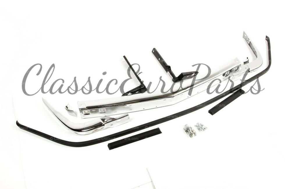 Some of the parts have been discontinued by BMW but we still do have many of these in stock- if you need some replacement chrome parts or any trim bit- please ask. Brand new Euro Chrome Front bumper set for your BMW E12. Great for converting to Euro spec- includes all of the brackets and bolts. Does not include turn indicators. The turn indicators can be purchased here: Click here These are brand new original BMW parts. Mounting: Euro spec cars: Front- bolt on Rear- bolt on US spec cars: Front bumper is mounted to the front frame rails using nuts and bolts- US cars need to have holes drilled to fit these bolts in the chassis rails. Fits: Any E12 (1972-1981) US and Euro